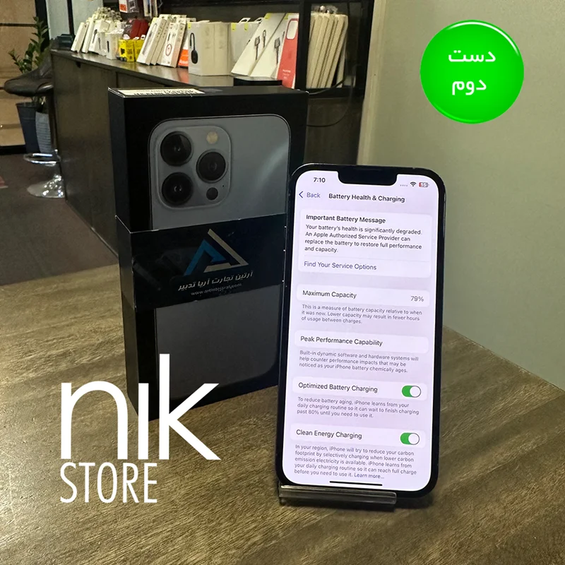 کلیه عکس های گوش دست دوم ۱۳ پرو مربوط به خود گوشی بوده و برای اطمینان شما عزیزان ۵ رقم از انتهای کد imei گوشی در بخش مشخصات ذکر شده است. این آیفون ۱۳ پرو دارای حافظه ۲۵۶ گیگ و باتری ۷۹ درصد اصلی می باشد. سلامت این دستگاه از طرف فروشگاه نیک استور تضمین شده و به شما اطمینان داده می شود که این محصول تا به حال باز نشده است . ۱۳ پرو آبی ۲۵۶ گیگ دو سیم دارای رجیستر و گارانتی شرکتی می باشد و در دوربین 3x دارای لک هایی می باشد . برای خرید گوشی دست دوم حتما باید کد ملی ، شماره موبایل و آدرس خریدار در فرم ثبت نام تکمیل گردد و همچنین برای مشاهده و تست شما عزیزان میتوانید به آدرس فروشگاه اپل استور نیک واقع در خ فرشته - خ بوسنی هرزگوین - مجتمع مینیاتور مراجعه بفرمایید .
