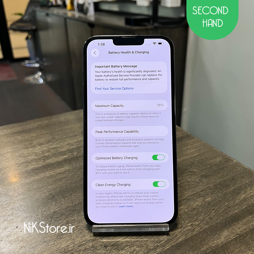 کلیه عکس های گوش دست دوم ۱۳ پرومکس مشکی ۲۵۶ گیگ دو سیم مربوط به خود گوشی بوده و برای اطمینان شما عزیزان ۵ رقم از انتهای کد imei گوشی در بخش مشخصات ذکر شده است . این ۱۳ پرومکس دارای حافظه ۲۵۶ گیگ و باتری ۷۸ درصد می باشد. سلامت این دستگاه از طرف فروشگاه نیک استور تضمین شده و به شما اطمینان داده می شود که این محصول سالم میباشد است . ۱۳ پرومکس مشکی ۲۵۶ گیگ دو سیم دارای رجیستری شرکتی می باشد. بدنه و صفحه نمایش این آیفون ۱۳ پرومکس مشکی بدون کوچکترین نقطه و خط و خش می باشد و دستگاه تا به حال باز نشده است .دوربین 3x بروی صفحه سفید لک دارد (طبق تصویر ) . برای خرید گوشی دست دوم حتما باید کد ملی ، شماره موبایل و آدرس خریدار در فرم ثبت نام تکمیل گردد و همچنین برای مشاهده و تست شما عزیزان میتوانید به آدرس فروشگاه نیک استور واقع در خیابان فرشته - خیابان بوسنی و هرزگوین - مجتمع تجاری مینیاتور مراجعه فرمایید . گوشی های کارکرده دارای ۷ روز مهلت تست فنی می باشد .
