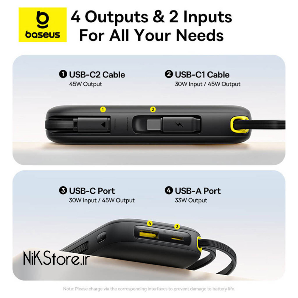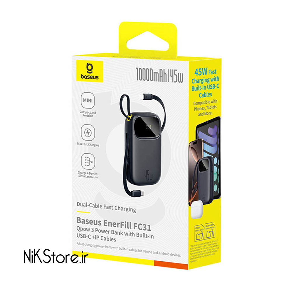 پاوربانک QPow نسل ۳ باسئوس ظرفیت ۱۰ هزار میلی آمپر ۴۵ وات مدل FC31 دارای کابل TYPE-C و لایتنینگ داخلی می باشد . این پاوربانک همچنین از شارژ سریع ۴۵ واتی پشتیبانی میکند و تضمین میکند که دستگاههای شما به سرعت و به طور کارآمد شارژ شوند. با گزینههای خروجی متعدد، از جمله USB-A، Type-C و کابلهای داخلی، میتوانید چندین دستگاه را به طور همزمان و بدون هیچ مشکلی شارژ کنید. صفحه نمایش دیجیتال یکی دیگر از ویژگیهای برجسته است که اطلاعات لحظهای در مورد درصد باتری باقی مانده را ارائه میدهد. این ویژگی به شما امکان میدهد وضعیت پاوربانک خود را در یک نگاه مشاهده کنید، بنابراین همیشه میدانید چه زمانی زمان شارژ مجدد است. FC31 از پروتکلهای شارژ سریع محبوب مانند PD، QC3.0، SCP، FCP و AFC پشتیبانی میکند و سازگاری با طیف وسیعی از دستگاهها را تضمین میکند.