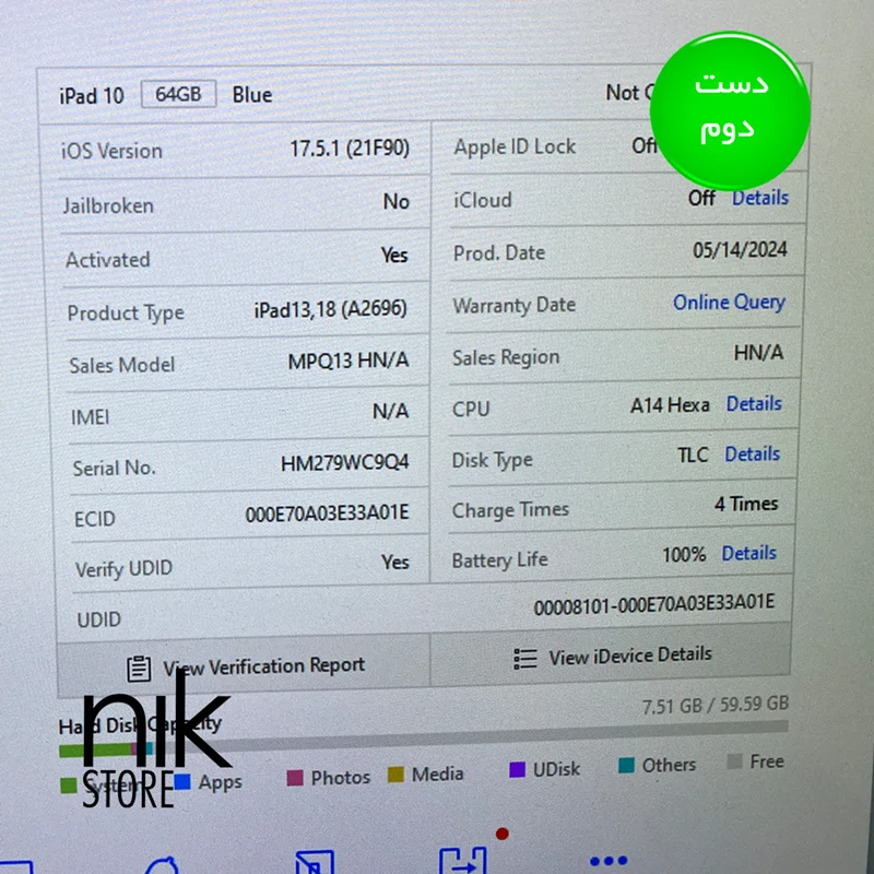 کلیه عکس های آیپد 10.9 اینچ دست دوم آبی مربوط به خود دستگاه بوده و برای اطمینان شما عزیزان 5 رقم از انتهای Serial آیپد 10 در بخش مشخصات ذکر شده است . این آیپد پرو با پارت نامبر A2696 دارای حافظه داخلی 64 گیگابایت و حافظه رم ۴ گیگ و سلامت باتری 100 درصد برای فروش گذاشته شده است . iPad 10 2022 تنها چند رو استفاده شده (فقط ۴ بار شارژ شده ) و بسیار نو و تمیز می باشد . این آیپ در ماه جولای ۲۰۲۴ فعال شده و تا یک سال آینده گارانتی بین المللی دارد همچنین بروی درب جعبه مقداری قهوه ریخته شده و جعبه آن کمی کثیف شده است . در مورد خود دستگاه از طرف فروشگاه نیک استور تضمین سلامت فیزیکی و فنی داده شده و همچنین یک هفته مهلت تست فنی خواهد داشت . برای مشاهده و تست آیپد نسل ۱۰ وای فای ۲۰۲۲ با حافظه ۶۴ گیگ میتونید به آدرس فروشگاه اپل استور نیک واقع در خیابان فرشته - خیابان بوسنی هرزگوین - مجتمع مینیاتور مراجعه بفرمایید .