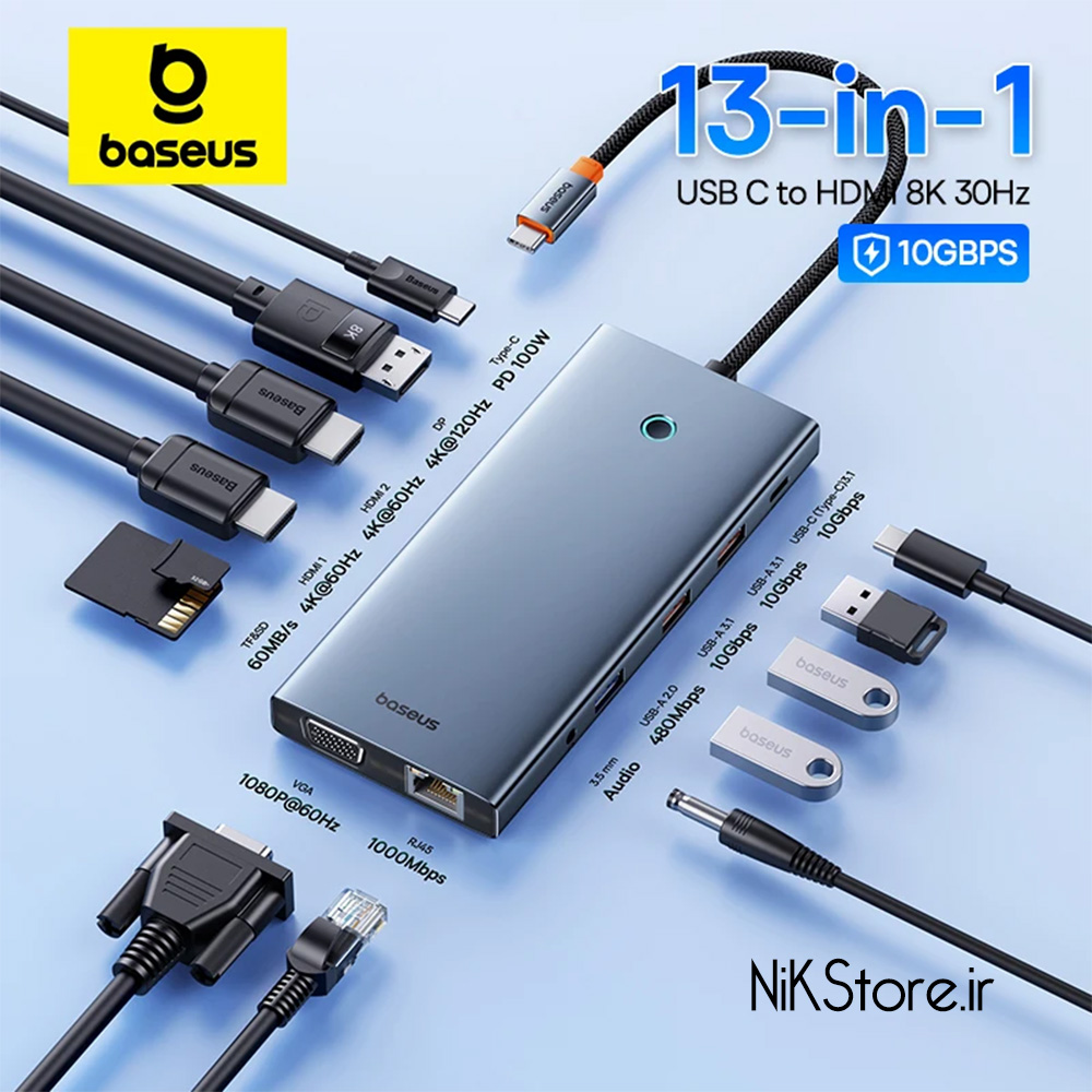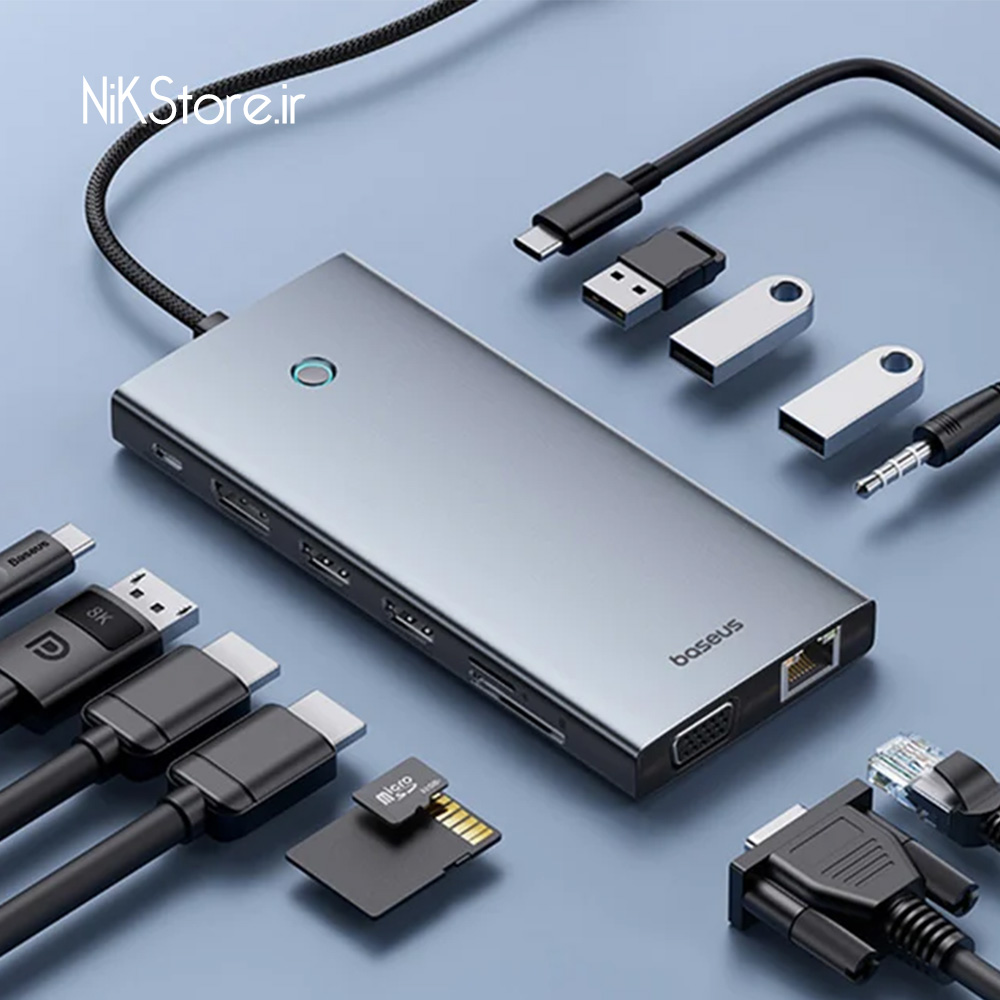 هاب USB-C باسئوس مدل B00053002811-01 دارای ۱۳ عدد پورت متنوع است که شامل ۲ عدد پورت USB 2 ، یک عدد پورت USB 3.1 ، یک عدد پورت تایپ سی (۱۰۰وات) PD ، پورت تایپ سی ۳.۱ یک عدد ، دو عدد پورت HDMI با کیفیت 4k ، یک عدد پورت شبکه RJ45 ، یک عدد پورت VGA ، یک عدد پورت DisplayPort ، دو عدد پورت میکرو و میکرو SD و یک عدد جک ۳.۵ میلی متر میباشد.هاب تایپ سی باسئوس مدل BS-OH161 با طراحی مدرن و جنس بدنه آلومینیوم و ابعاد بسیار جمع جور و سازگاری با سیستمعاملهای ویندوز، مکینتاش، لینوکس و ویستا یک انتخاب حرفهای و کاربردی برای افرادی است که به دنبال افزایش تعداد پورتهای دستگاه خود هستند .